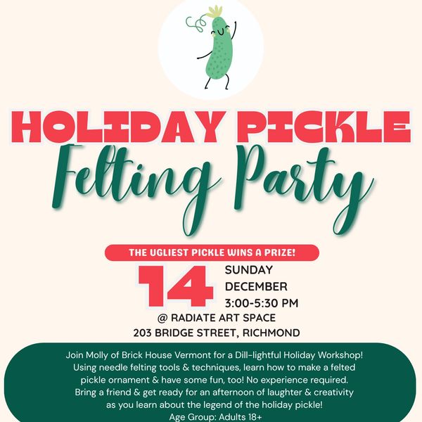 Join Molly for a Dill-lightful Holiday Workshop! Using needle felting tools & techniques, learn how to make a felted pickle & have some fun, too! Bring a friend & get ready for an afternoon of laughter & creativity as you learn about the legend of the holiday pickle!